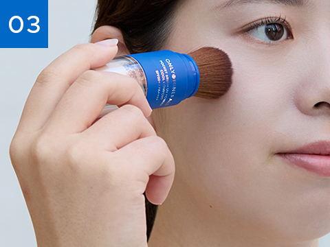 顔の中心から外側に向かって、ゆっくりなでるようにやさしく塗り広げます。パウダーの出が少ないと感じた場合は、②を再度行ってください。